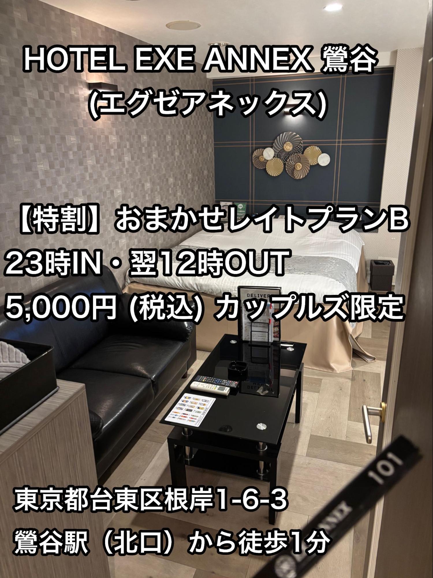 JR鶯谷駅の北口から徒歩で1分。「ホテルEXE ANNEX(エグゼアネックス)」…元三島神社の正面という好立地にして23時以降のチェックインでなんと宿泊5,000円(税込)でございっ!